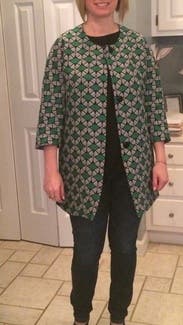 Loved this coat! The fabric is beautiful and the pattern is really interesting. Very comfortable and light enough to wear on its own in the spring, but I winterized with black turtleneck to wear in February. A boxy cut, so I would suggest wearing something fitted underneath or sizing down.
