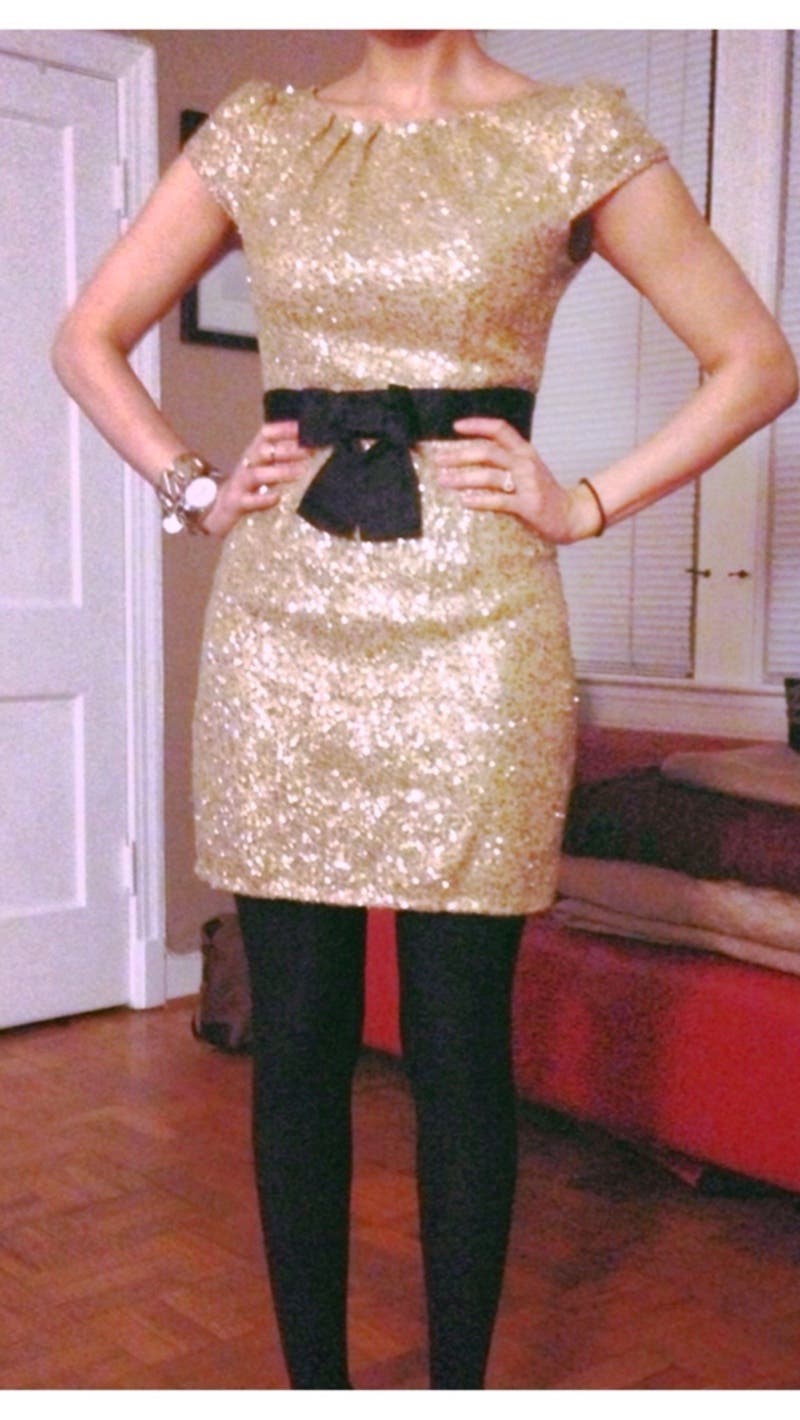 Gold sequins over silk. Crew neckline with pleating. Capped puff sleeves. Black satin bow. Hook-and-eye closure. Hidden back zip. 33'' from shoulder to hem.