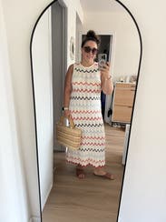 Was obsessed with this rental! So comfy yet looks chic and perfect for a vacation dinner. Fit was perfect for me. Not see through at all either despite small holes in the knit.