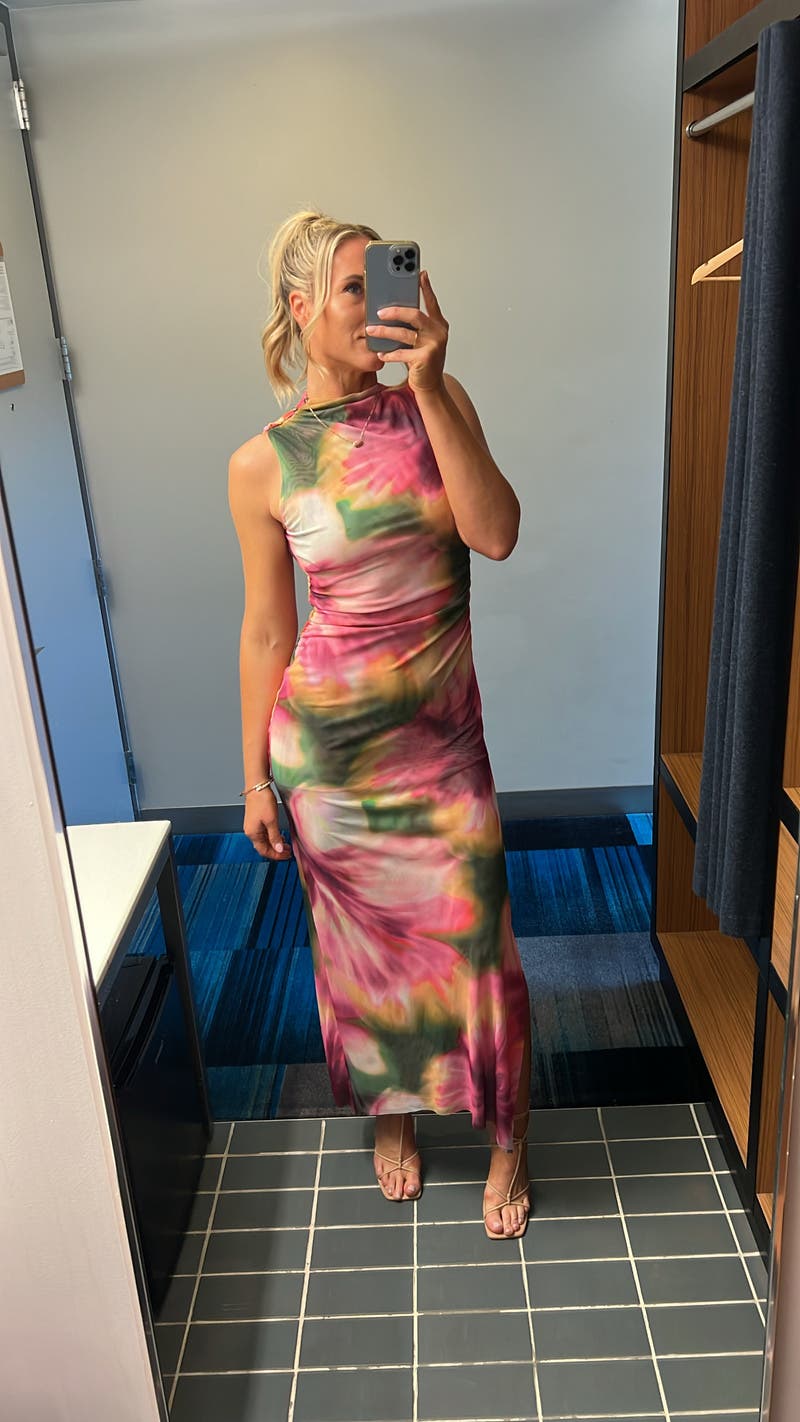 The MISA Los Angeles Athena Dress blends romance and ease with its breezy silhouette and delicate details. Pair it with strappy sandals and gold jewelry for an effortlessly polished look.