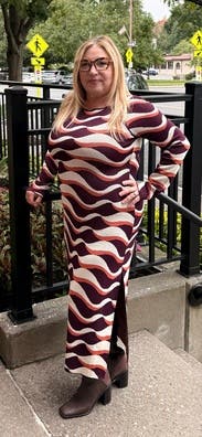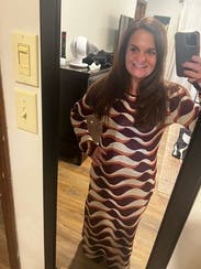 Very comfortable and flattening dress for fall. The pattern is different. I love the silt on the side. I really thought about buying the dress