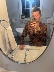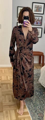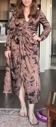 This dress is gorgeous but definitely not a “workday” dress. The fabric has that satiny sheen that instantly makes it feel more evening than office, and the deep V-neck adds to the dressy vibe. The wrap style is flattering, and the print is rich and elegant, but it’s absolutely more of a dinner-out or event look than something you’d wear to meetings. Beautiful—just a little too glam for the workplace.