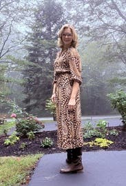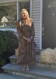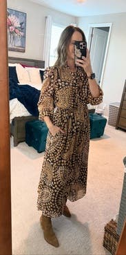 I wore this dress for Thanksgiving this year and it was perfect - chic, comfortable, and beautiful. The dress fit true to size, but is very flowy so you could probably get away with sizing down.