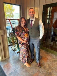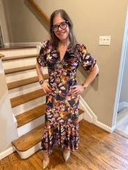 I wore this to two formal events during my third trimester. The color, pattern, and velvet material is beautiful for fall. Note there is an opening under the cleavage that might be a little revealing for work.