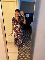 Really comfortable, soft, flattering dress. I ended up needing to go braless but I think if you used boob tape or generally put more effort in than I did you’d be okay. Super vibrant, tons of compliments.