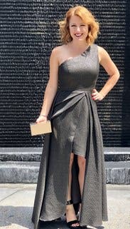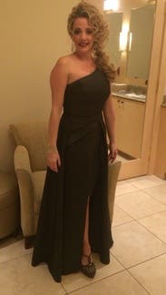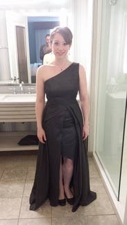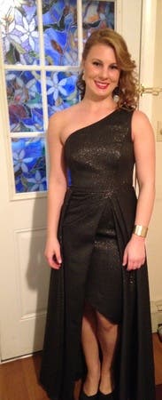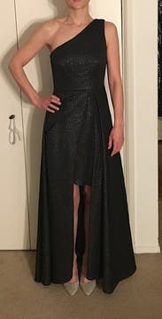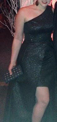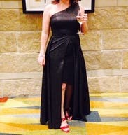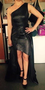 I felt like a rockstar in this dress! It is perfect for a very formal black tie event. I felt glamorous and incredibly comfortable. I've never been to a black tie event and decided to take a risk with an asymmetrical dress. I have 32DD's so anything that requires a strapless bra scares me because my "ladies" end up saggy. My torso is a little short, so that definitely is no good. I'm almost an hourglass (I think my waist has to be a tiny bit smaller to be a true hourglass?). I also generally don't go asymmetrical because I think I'm just boring and scared of new things. I am sooooo glad I went for this piece! The strapless bra worked out fine and the cut divided my body in a flattering way. The curtain effect on the lower half was awesome. The material is fairly thick. I know this sounds bad, but almost like drapes. That being said, it works and is incredibly comfortable. I wore it in April in LA in the evening, and it was perfect. It might be too hot for a summer event. I'm short so I wore a higher heel and it didn't drag on the ground. Also, make sure you wear a shoe that is open across the ankle. Make those legs look long!