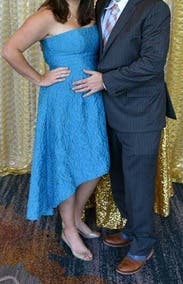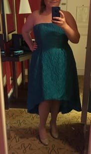 I rented this dress for a charity gala and as expected, most other women were in black. I loved standing out. I have a 4mo old baby so I'm struggling with baby weight in new areas. I found the size 14 to be tight around my waist and loose around my chest. I felt beautiful in this dress and loved the high-low hemline. I paired it with black and silver accessories.