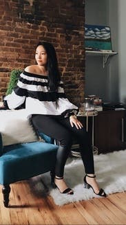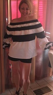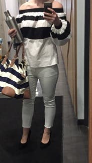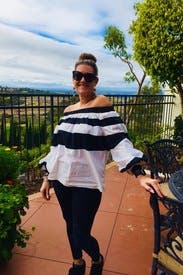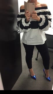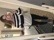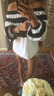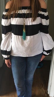 This top was okay. Definitely not my favorite rental. It's one of those off the shoulder tops that you are constantly messing with. Got very wrinkled throughout day. Love anything black and white striped though. Fit was true to size.