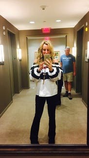 Cute shirt, lots of compliments but difficult to wear. Constantly trying to reposition off shoulders. Felt like a T-Rex because I was unable to extend my arms for fear the shirt would slip up shoulders and I'd have to reposition it yet again. Wouldn't rent again, but it was cute.