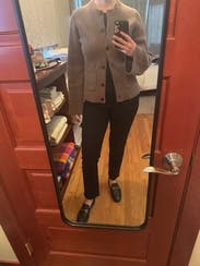 This sweater is more fitted than your average cardigan which gives it a neat, more tailored look. Wore it with jeans for a casual look and with slacks for a more work-friendly look.