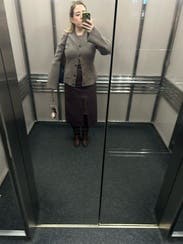 This sweater is perfect and cinches at the waist. I wore this to work and it was perfectly warm and an elevated look in the office. Want to buy!
