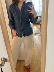 Loved this top and got so many compliments. Wore with barrel jeans for a denim tuxedo look and red mesh flats - so chic!