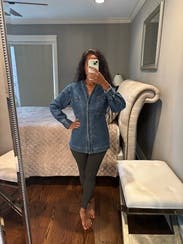 Wore a few times at work. The weather is getting warmer though. I would’ve probably rent again. Very cute buttoned up denim “blazer”. Wore with black flair pants and Jordans. They worked well together.