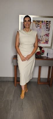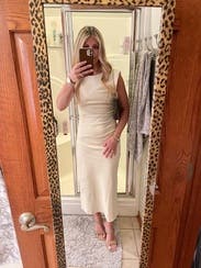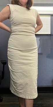 This sleek, cream midi dress by Modern Citizen lends elegance with its form-fitting silhouette and subtle ruching detail. Perfect for a sophisticated evening, pair it with statement earrings and strappy heels to complete the look.