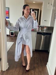Has the unique features we love about Monse. I got a 6, and I probably needed a 4, so I styled it with a belt. Also the front area has weird buttons. Both inner and outer, and it seemed to kinda gap open. The fabric was nice. Not as wrinkly as some other shirt dresses.