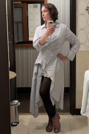 This dress can probably be buttoned 100 different ways, so take your time and give it a chance. While I find the collar on the hip to be a bit tricky to manage, overall I love this clever Monse riff on menswear. I rolled the cuffed sleeves once for ease and found the length to be fine with flats. Very cool item. Rent this.