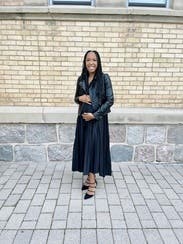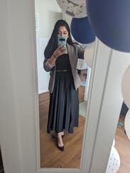 I started out wearing the dress with a belt and then took it off to let my 24-week bump do its thing! Very flattering and sophisticated dress - I wish I could keep it! Wore a strapless bra and didn’t need shape-wear otherwise.