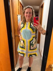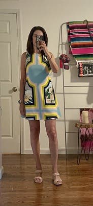 Easy shift dress to throw on, not the most flattering shape. Pattern/colors are great