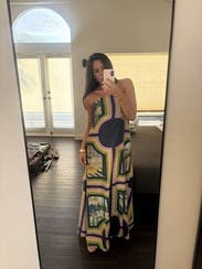 Silky and soft material with such a beautiful, vibrant pattern. You'll get a lot of compliments in this dress! It runs 1 size big so I suggest sizing down.