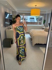 Love this brand! Another great dress by Muma World :). Strapless & flowy…has the little adjustment in the back to create a bit of a shape. Hit at the floor on my 5’5” frame, wore with dressy flat sandals. The strapless top area can be tricky, kind of flattens the chest and a strapless bra kind of worked against it, I just went without. Lots of compliments!