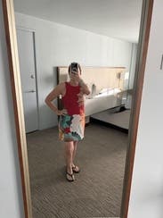 Absolutely loved this dress. It skimmed my body perfectly and was a fun and flirty outfit for a casual welcome-drinks-before-the-wedding event. Would be great for a date or with more casual shoes, for the daytime.