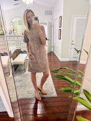 This dress is big but it’s also the softest tweed I’ve ever worn making it the perfect cozy work dress. The dress looks more pink in the picture but the tweed is red, orange, yellow, white and black (pockets!! are lined in a burnt orange). Pair with heels or with black tights and boots as we head into colder weather.