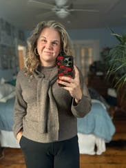 This luxurious NAADAM Cloud Cashmere Layered Crewneck Sweater is a sumptuously soft, lightweight cashmere knit with a unique draped layered design. Pair this cozy piece with sleek silk trousers and delicate pointed-toe flats for an effortlessly elegant ensemble.