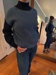 I loved this sweater! The ribbed fabric with different alternating blues was subtle and so fun. it's warm and cozy and perfect for WI winter.