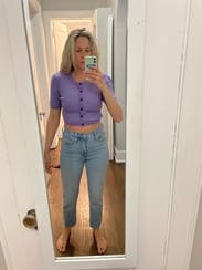 The color is dreamy and the material is so soft & stretchy. I found the crop to be perfect, it pairs great with high-waisted pants. My only regret was not sizing up, as I found the sleeves to be a bit tight and restrictive around my arms.