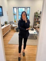 This too was more of a jacket for me. It looked black in the pic and I didn’t look closely at the description. It’s a nice navy color and looks good with white slacks. It’s really soft and comfy; an unstructured look. This one is easy to wear and I’ll probably get it again.