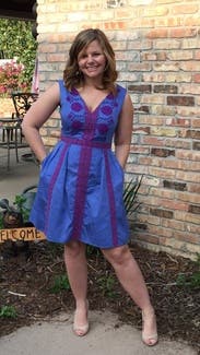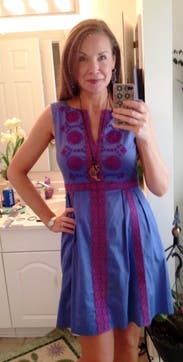 I wore this dress to the alumni parade and picnic luncheon at my 25th high school reunion in June. It was incredibly comfortable, appropriate in length, and the embroidery detail was downright lovely! The color was amazing, and I felt stylishly confident yet still casual and fun in this. At the time I wore this dress, I was about 135 lbs, so I went with the 6, and it fit perfectly. The 8 was fine but a little loose, and I wanted to show off my figure. Wish I had this one in my personal closet! It was a keeper!!!