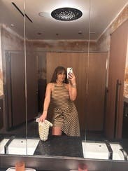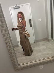 What an elegant dress! It’s all one piece and will go over your head, so keep that in mind when you do your hair. It was a little tight getting it down past my chest, but once I did, it fit like a glove. It will stretch so I found it easy to wear. I paired it with black wedge sandals and wore out to dinner and then to Bourbon street in NOLA. It wasn’t an ideal walking dress as the long skirt kept getting caught up in between my legs and in my shoes. But I managed just fine. Tons of compliments on this one. It’s so unique and definitely makes a statement.