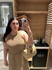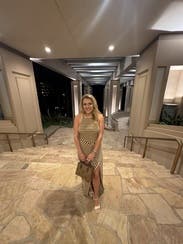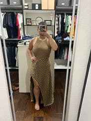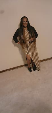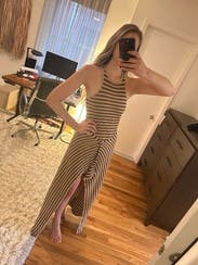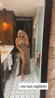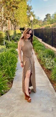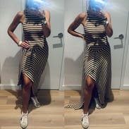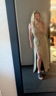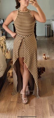 I rented this dress and had a great experience wearing it. The ribbed knit fabric provides a unique texture, making it both structured and comfortable. The vertical stripes on the bodice are flattering, and the diagonal pattern on the skirt adds movement and dimension. The high slit offers a bit of drama without overdoing it. Fit & Comfort: The dress fits true to size with some stretch, making it forgiving. The halter neckline is chic and elongates the shoulders. I could move comfortably all night, and the material didn’t feel too heavy even though it’s a knit. Style: This piece is versatile—you can dress it up with heels and statement earrings for a wedding or cocktail event, or down with sandals for a more relaxed but polished look. The neutral color palette also makes it easy to accessorize.