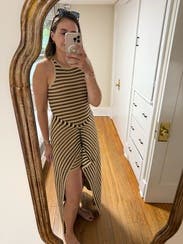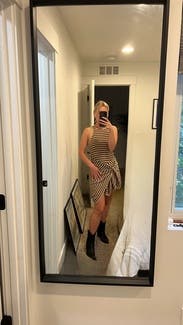 Loved this dress! Comfy fabric, great fit, and unique design. I’m pretty short so the skirt lightly grazed the ground with flat shoes on….. however, I found that tying the skirt up around your waist made it into a cute mini dress if you aren’t looking for a floor length moment.