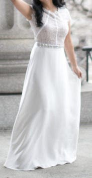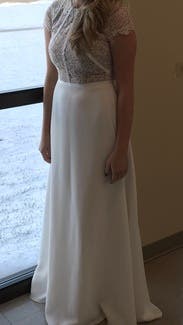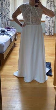 I rented this for my backyard wedding. There weren't many options on rtr for the actual bride but this one was perfect for my occasion. I couldn't believe how amazing it looked on me. My only con was that the regular was a little too long for me so I had to wear bigger heels so as not to drag the dress everywhere. I'm around 5'3 for reference, but short option wasn't available.loved the lace component of the top and sleeves. It made me look thinner. It felt so romantic and classic.