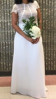 Picked this dress out for our elopement at city hall. It was very comfy and and didn't have to worry too much about my undergarments! I did end up having to size up because it does cinch at the waist too much. I also found a nice jeweled belt to bring it all together. Glad I was able to use this as my something borrowed!