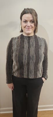 Great weight and texture to this top. Wore this often to the office, to nights out. Flattering on larger chests and broad shoulder athletic builds. Between sizes, def size up.