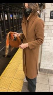 This long heavy wool coat is good for mid-winter/below freezing. Petites beware. I'm usually a Medium/6 in coats and the 4 fit perfectly. I could wear a jacket/sweater under. A 6 would have probably worked too, but not a 2. Loved the spilts on the sides rather than the back. Dark camel color. Black lining. Two front pockets. Secure buttons. This is a classic coat that I wore for an unseasonably early cold snap. Not a compliment magnet but keeps you warm.