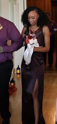 This dress was sent as a replacement for a delayed dress. I didn’t end up wearing it to the event because the original dress I ordered came on time. Very pretty, great fit. Super light weight dress