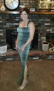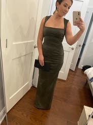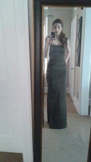 Felt very sexy in this dress! It was my back up and I fell in love with it. Material was nice and thick, no need to wear a bra and the ruching was perfectly placed to enhance all your best curves. I'm almost 5'9" and even in heels it was long enough which is hard for me sometimes. In person it looks like a metallic charcoal in some pictures it looks like an emerald green. Highly recommend!