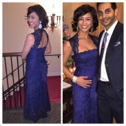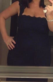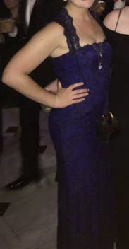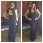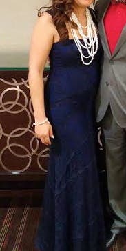The dress was surprising lightweight for a dress with this much lace. I chose the 2R to wear based on the reviews that considered my height and the 4.5 in heels I wore with this dress. I don't know if I would say this dress is true to size or runs large as I typically wear dress sizes 2-6 depending on the designer. The dress is a beautiful navy blue and was perfect for the black tie optional, fall wedding that I attended in Washington DC. This dress hugs in all the right places (gave me the illusion that I was curvier and slimmer than I typically am) and was comfortable to wear and dance in all night. I paired the dress with statement earrings and a bracelet from RTR as well.The only thing that annoyed me was that my heels would get caught in the lace a few times. I was bummed that my original dress I was planning on wearing was damaged before the event but thankfully RTR came through by giving me the option of renting this dress as a result. While I didn't get many comments at the wedding, I did get a lot of positive responses on my social media accounts of me wearing this dress.