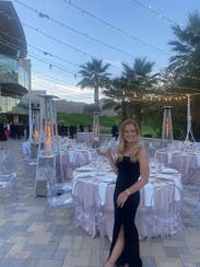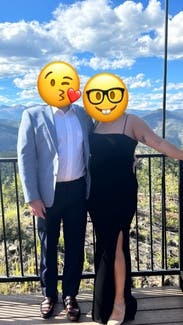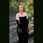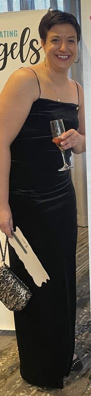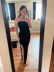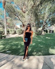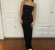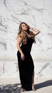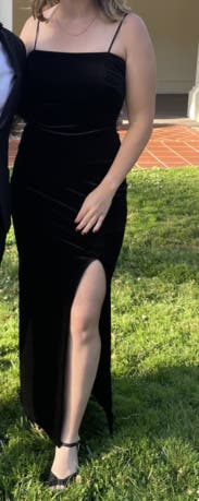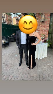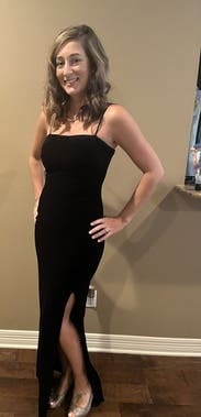 This dress is sexy but classic at the same time. The material is so soft and very flattering - I got so many compliments! The long was perfect for my height. I opted for sticky boobs over a strapless bra, but you could go either way. The slit is just high enough while not being too revealing on the dance floor, and it didn’t wrinkle at all.