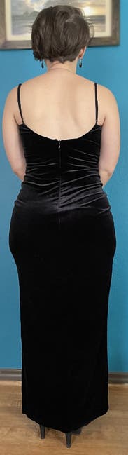 This dress was perfect for a black-tie wedding I attended. I'm usually a size 10 / M-L, but based on reviews I was hoping the size 8 would fit and it did perfectly. I felt like it showed off curves in a good way and was very comfortable. Didn't need to wear a bra or any fashion tape. Would definitely rent again, and I am 100% looking into purchasing this dress or a similar one, as I feel like a dark color velvet dress this style would be a great staple to own for future events.