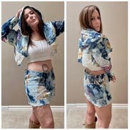 Upcycled multicolor denim (90%, 7% Polyester, 3% Lycra). Denim mini. Front zipper fly with button closure. 12" from waist to hemline. Patterns vary by piece. Made in the USA.