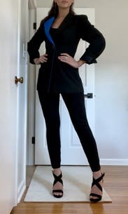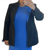 Really great piece. Lays beautifully along the body. Arms were a bit narrow for me, but it fit my petite frame well in the the shoulders and underarms/bust. (I have upper body muscle, so take that with a grain of salt.) It’s definitely slim cut blazer that’s long in the waist though. The button sat a little low on me. I wore it open, because it was a bit too slim to sit with it buttoned comfortably. I’m considering getting a size larger to see if there’s any give. Wore with Spanx wide-leg ponte work pants and it worked well as a “suit”.