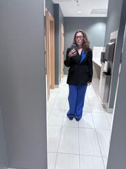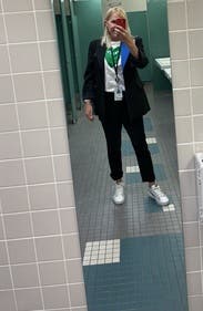 Another workday - another bathroom pic but this time I have a clean room bag on my shoulder - ignore the hair et al. Compliments all day - the pop of color enabled a fun tee and shoes with same. Fit great and when chilly I did raise the color - which says NINA in white cap :)