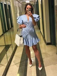 I wore this for powder blue game. Got tons of compliments on it. The top button popped open a few times but I am D size so probably why. Don’t hesitate it is a fun statement piece.
