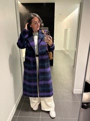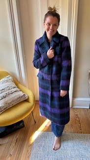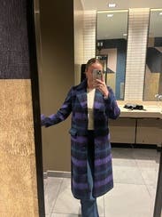 Purple/Blue Plaid (95% Polyester, 5% Laine, lining 100%Polyester). Coat. Long Sleeve. Button Front Closure. Shoulder to hemline: 44". Imported.