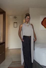 This top will quickly became a favorite for hot summer days. The sleeveless design kept it super chill, perfect for staying comfortable even under pressure at work. The fabric was top-notch—lightweight yet fully covering, ensuring no transparency issues. What really set it apart was the extra special flare of the flowing layers, adding a touch of class to any outfit. I absolutely loved it. One night, I wore it out to a local Italian restaurant over jeans and grey tennis sneakers. Another day, I paired it with black Zara trousers and a bright aqua blazer for a pop of color at work. It’s versatile, chic, and a true wardrobe staple. Highly recommended!
