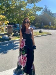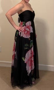 This One33 Social gown features a strapless design with a romantic floral print cascading down a flowing black skirt. It radiates elegance and femininity, perfect for formal events. Pair with simple heels and minimal jewelry to let the dress make the statement.